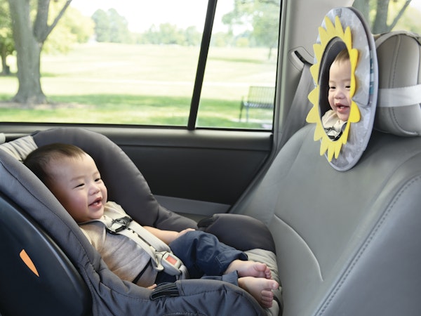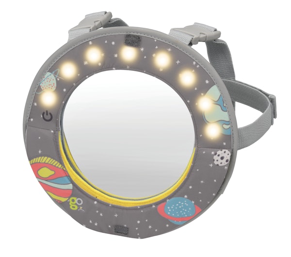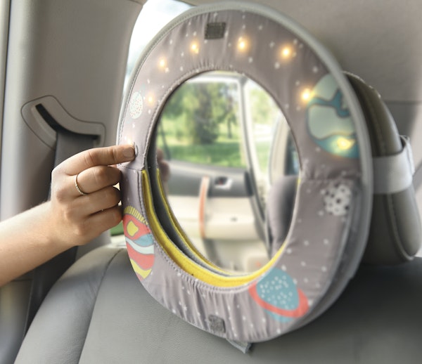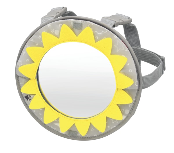 Our must-have travel mirror allows you to check on your backseat traveler with one quick glance. Little travelers will flip for this fun backseat mirror! In daytime mode, the musical sun keeps baby engaged and entertained. Convert to nighttime mode to reveal a galaxy of soothing lights.